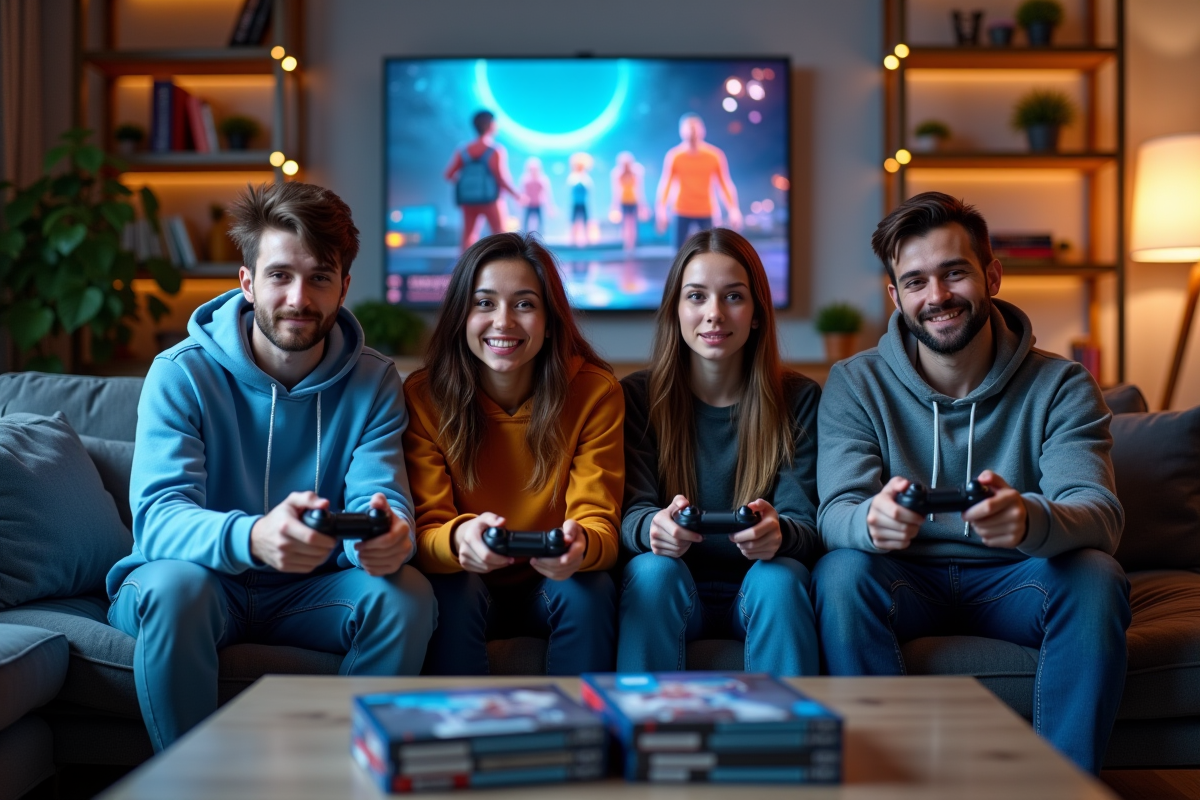 Groupe de jeunes adultes jouant à la console dans un salon moderne